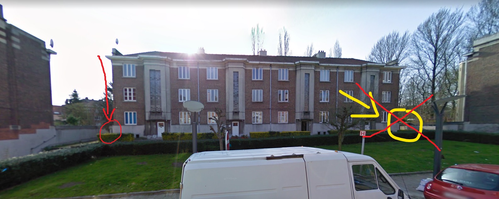 Pour y accéder : 28 rue des Résédas, par la porte à gauche sur le côté du bâtiment. La clé ouvre uniquement la porte à gauche du bâtiment car la droite est bloquée.